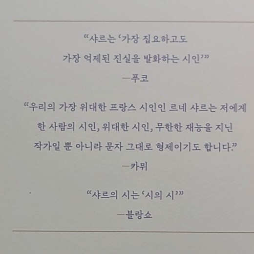 기회가 되신다면 읽어 보시면서 르네 샤르라는 시인의 에너지와 힘이 어디로부터 나오는 것인지 그의 삶과 글의 세계를 여행해 보시면서 찾아보는 것도 나쁘지 않을 듯 합니다.